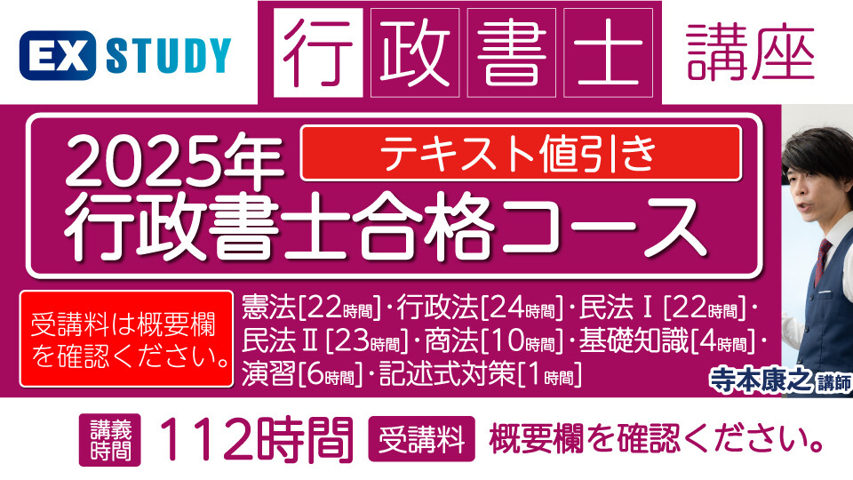 行政書士試験指導歴10年超・勉強から離れた社会人受験者にもスッと頭に入る!「わかりやすさ」、「伝わりやすさ」に定評がある寺本康之講師による行政書士講座!令和7年試験に向けて、時間も場所も自分のペースで、効率的に学習しましょう!